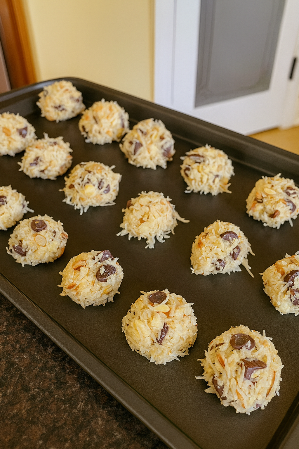 Soft, chewy, coconut-chocolate clusters — no flour, no fuss, just mix and bake!