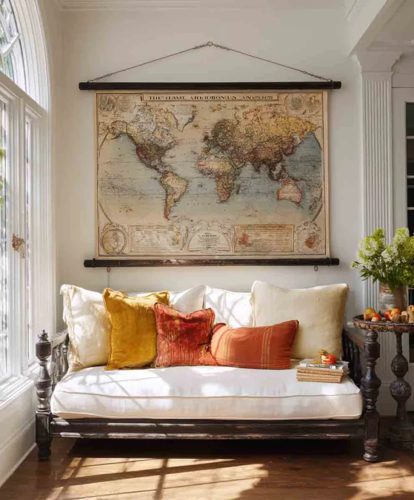 I scored an old school pull-down map at a yard sale and hung it right above my couch, it brought this cozy, lived-in feel that made my space feel like a storybook.