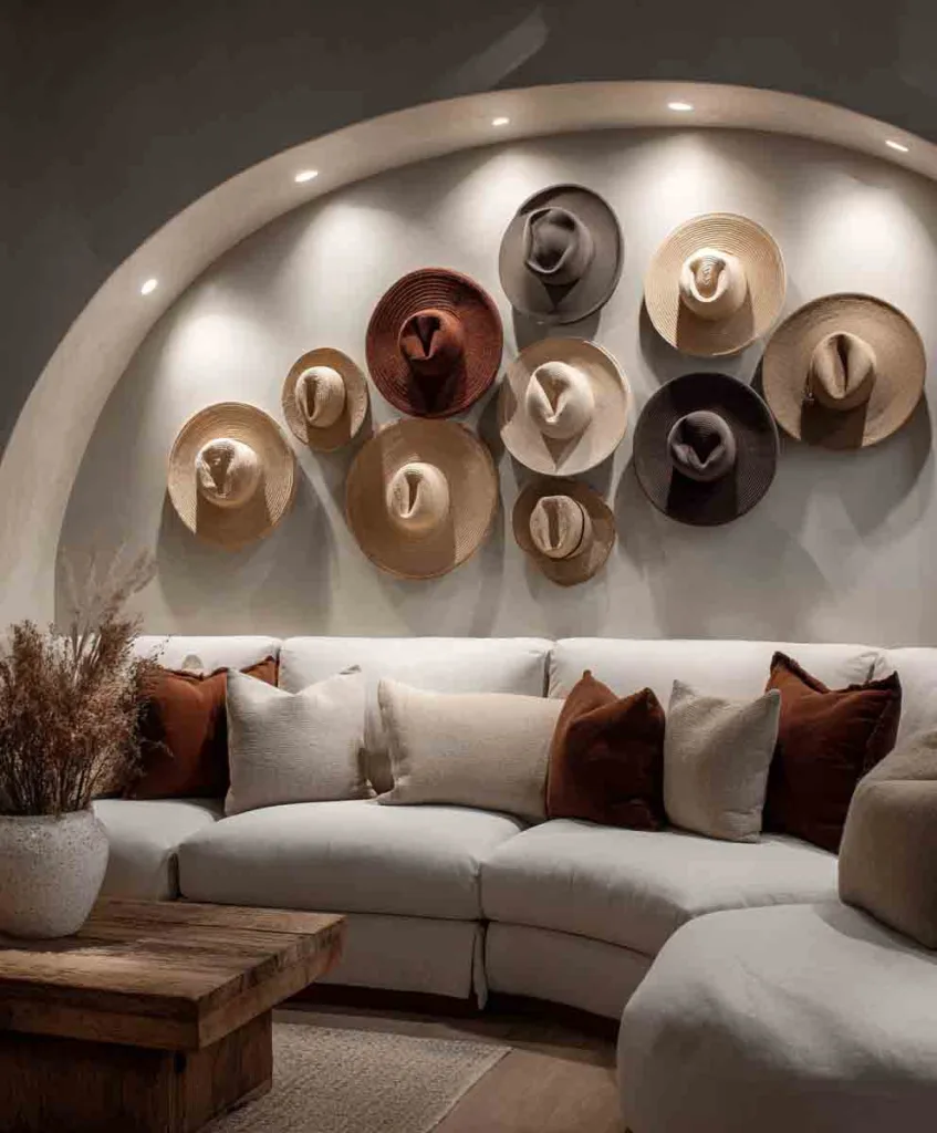 This is for my fellow hat hoarders. I used to stuff mine in drawers, then I tried hanging them in a crescent shape above my couch, and boom, instant texture and character.