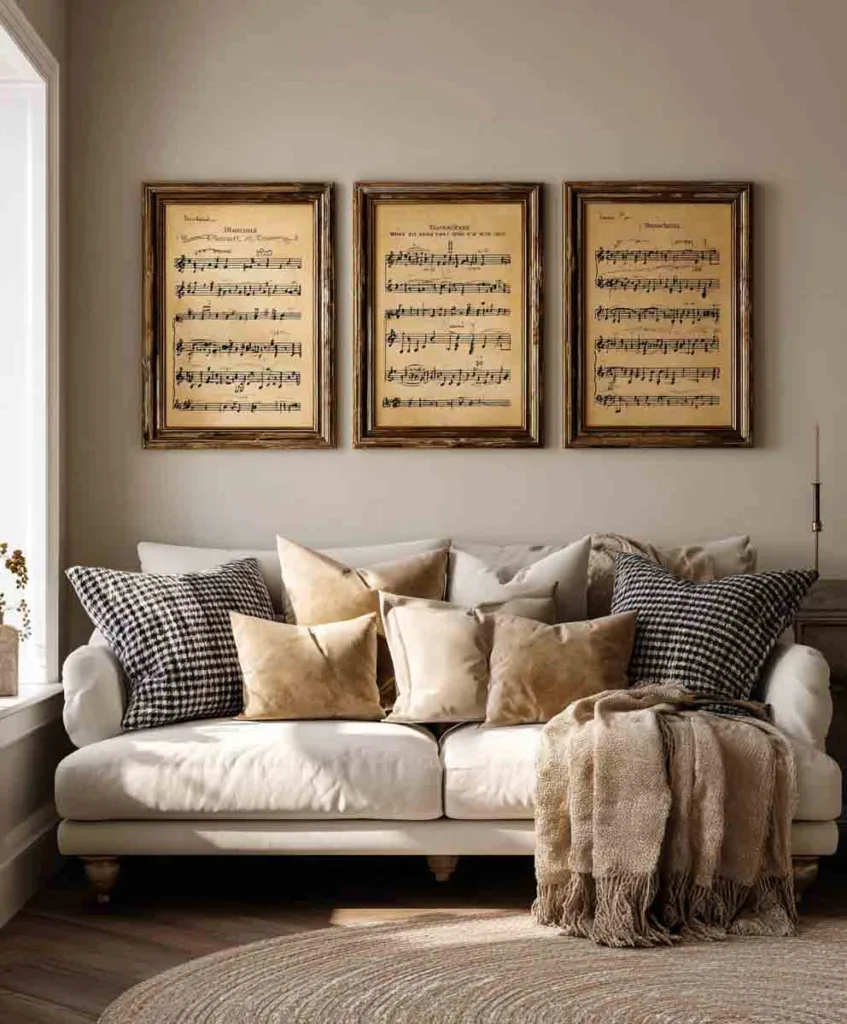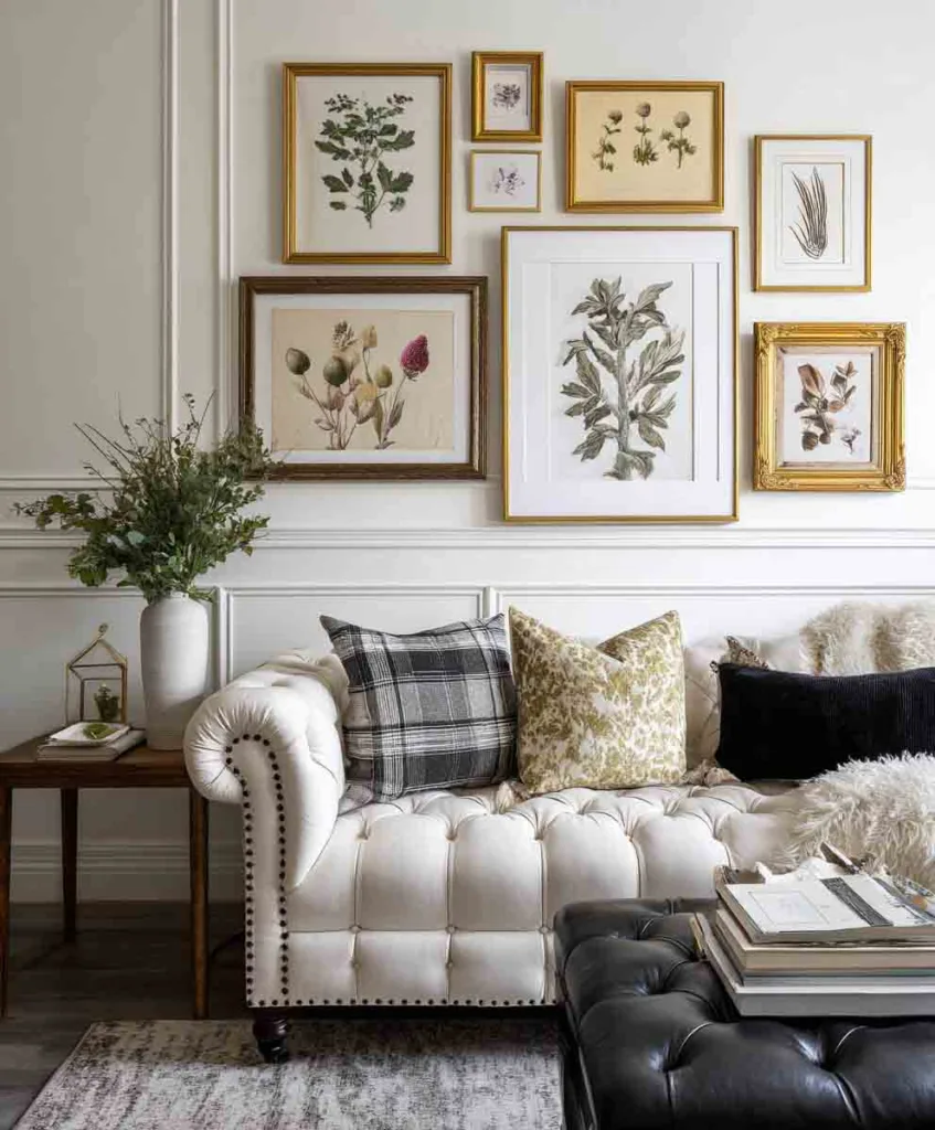 - Stick to a vintage theme: think botanical, architectural drawings, or black-and-white portraits.