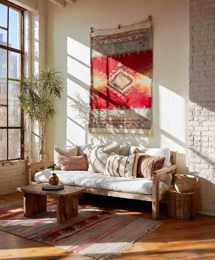 There’s something so warm about a hanging rug or textile above a couch. I found an old Turkish kilim and hung it behind mine with a curtain rod, it brought so much texture and history into the room.