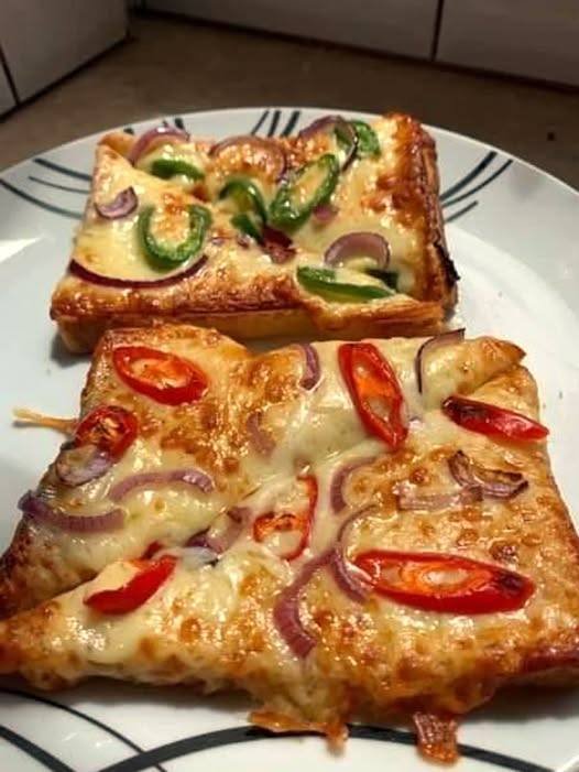 2️⃣ Spread pizza sauce evenly on bread or pastry.
