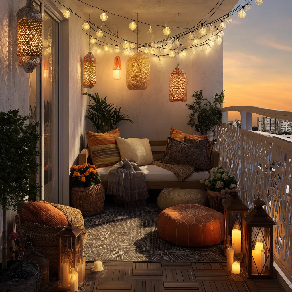 🌙 My Setup: I draped lights across the railing and added a few lanterns in corners. At night, it feels like a secret rooftop garden.