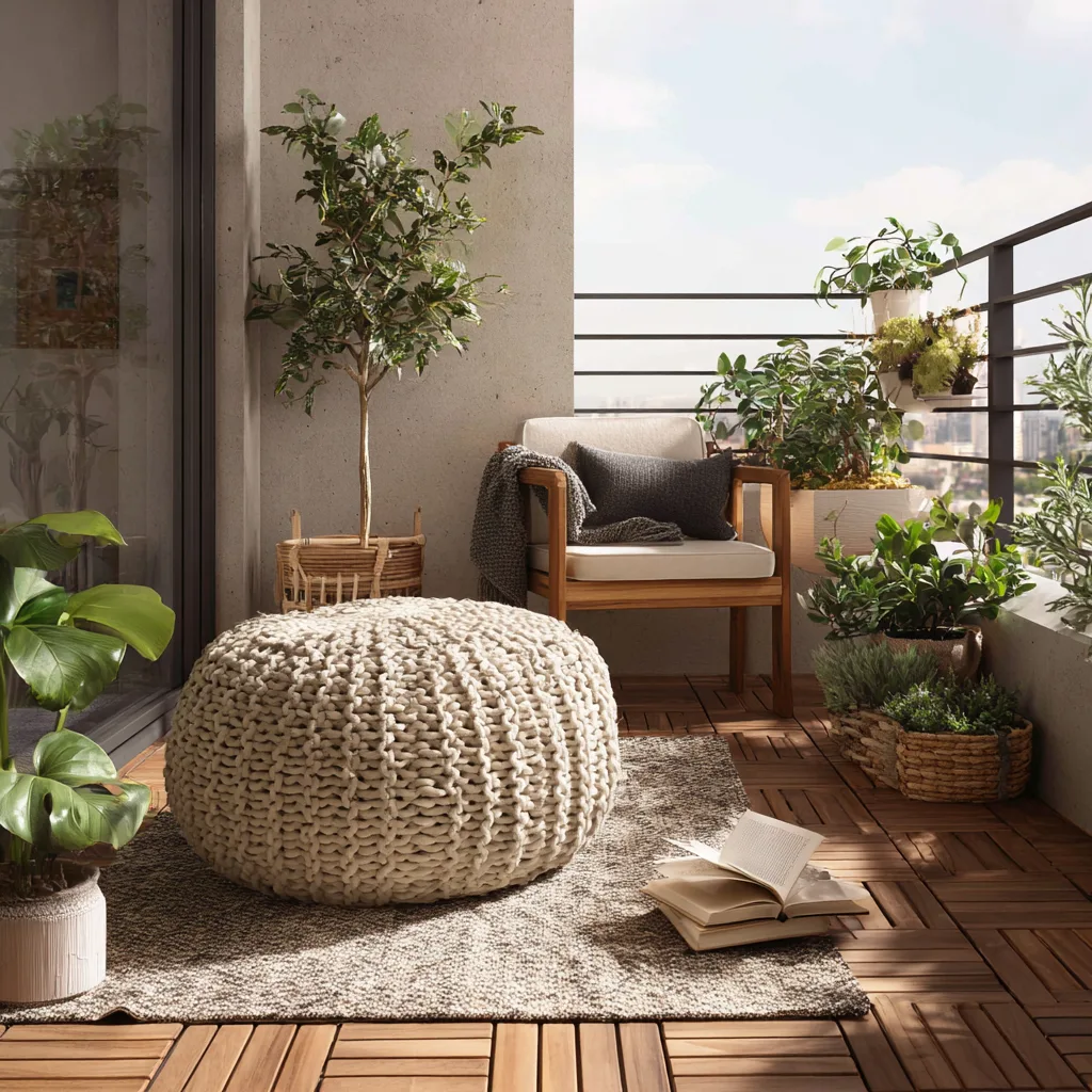 I found a chunky knitted pouf at a local market and couldn’t resist—it’s now my favorite spot to sit.