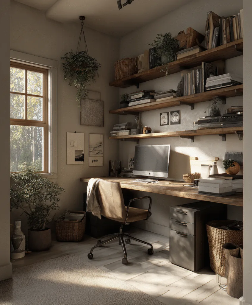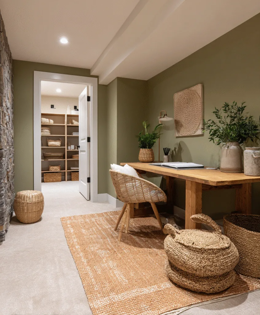 I painted one wall a soft olive green and paired it with a terracotta rug and some woven baskets. It’s like working in a little forest sanctuary.