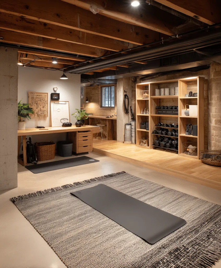 Need to multi-task your basement space? Combine your office with a mini gym setup. I placed a small standing desk near my yoga mat and dumbbells, and now I can sneak in stretches between calls.