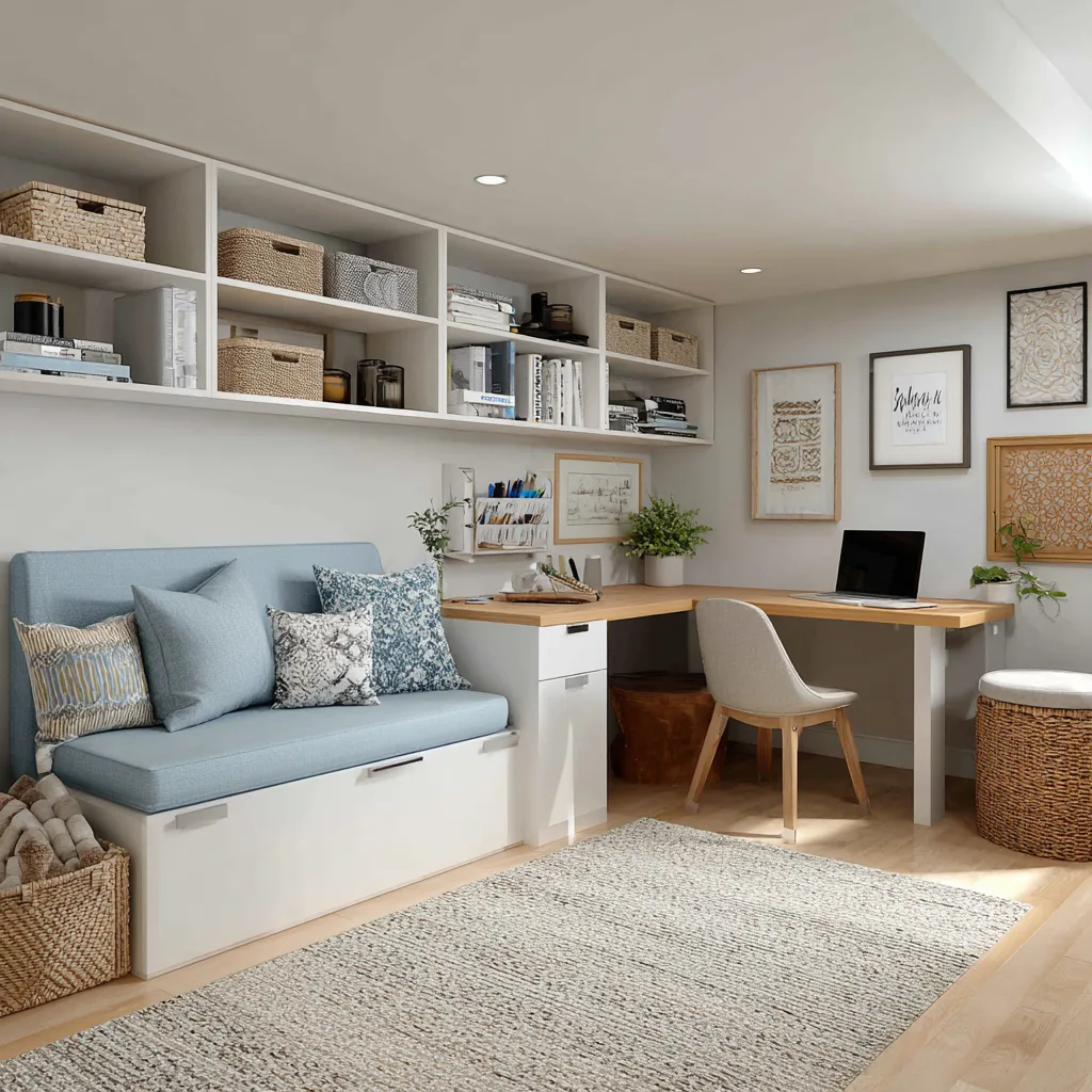 Whether you’re after calm vibes, bold colors, or clever layouts, there’s a setup that’ll work for you. I’m telling you, your dream office might just be hiding downstairs. 🛋️💡🪴
