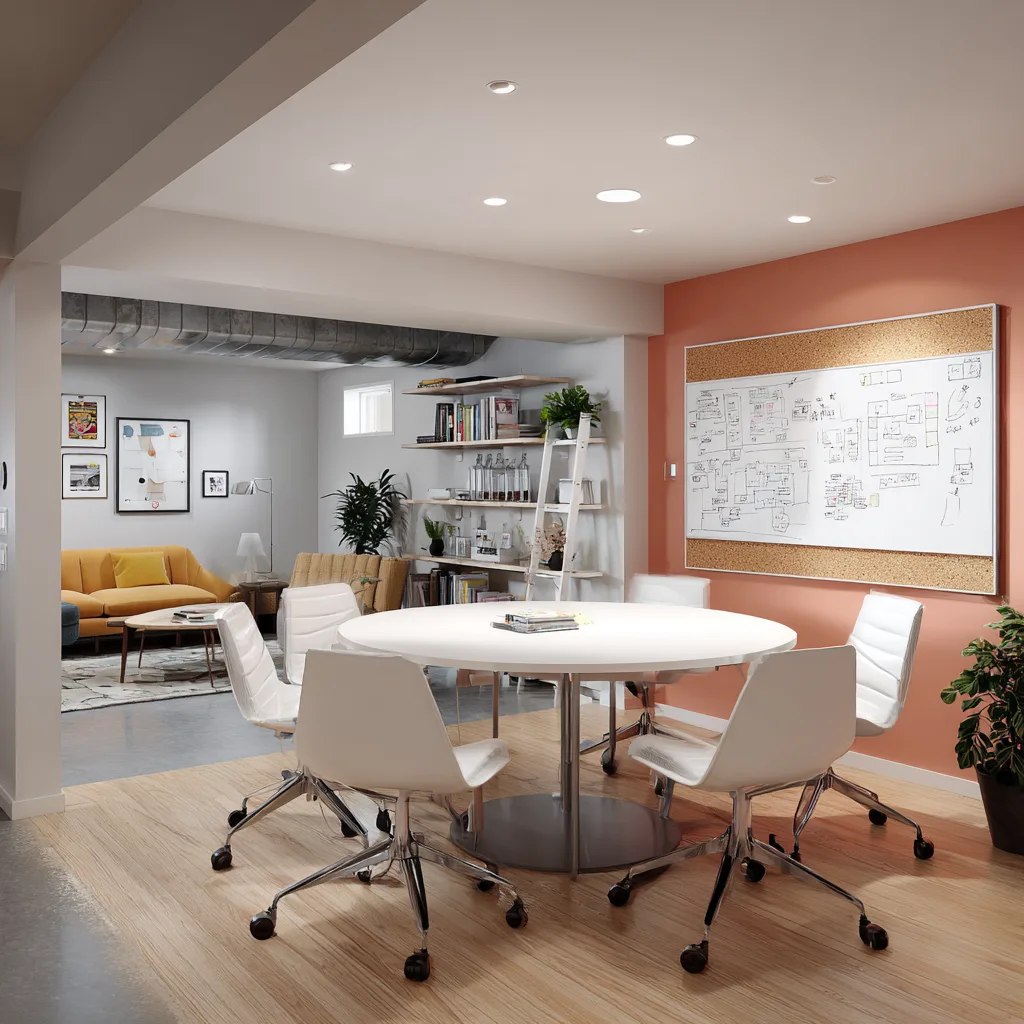 We added a round table and whiteboard in our basement, and it’s now the go-to space for brainstorming (and, okay, family game nights too).