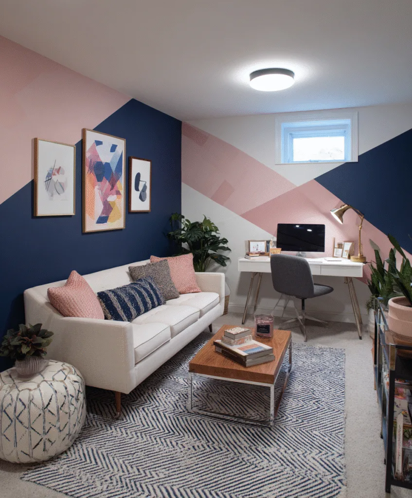 I used navy and blush pink in big geometric shapes, sounds wild, but it works. The result? A space that actually makes me excited to sit down and work.