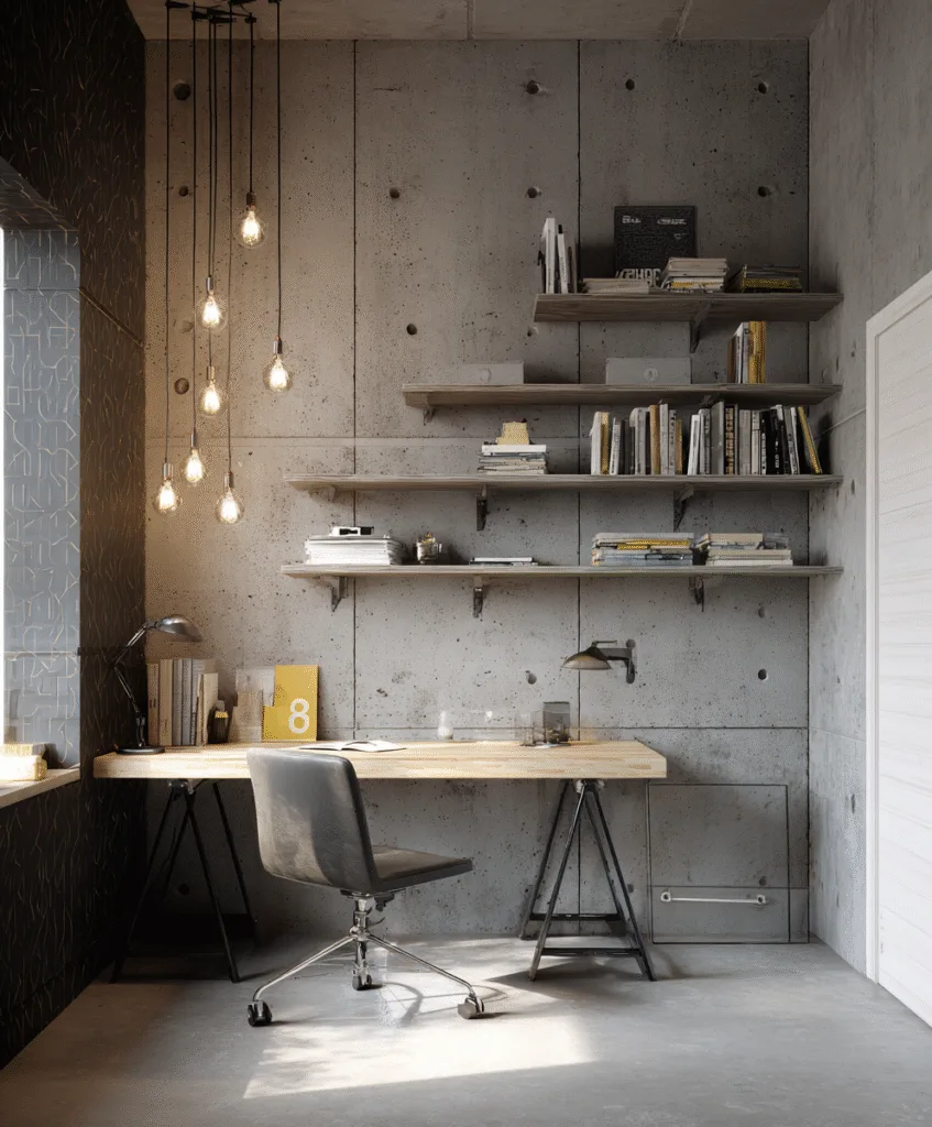 We left our concrete wall exposed, added black metal shelves, and used Edison bulb lighting. It gives cool creative studio without feeling cold.