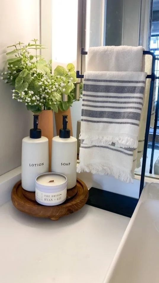 Trays have become one of my favorite countertop hacks! This one holds glass jars for cotton balls, neatly folded towels, and a candle.