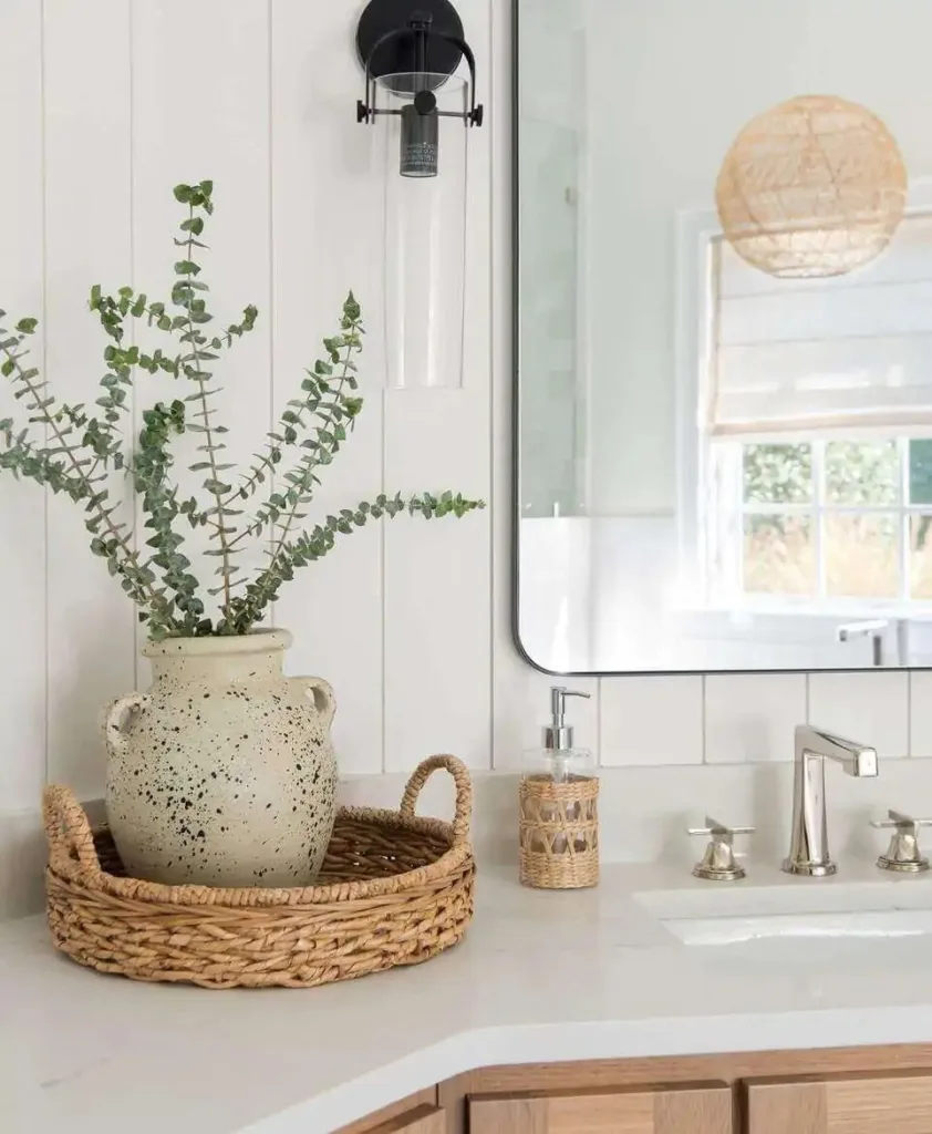 A textured ceramic vase filled with eucalyptus stems brings life and structure to your bathroom. I use this setup to brighten up dull corners.