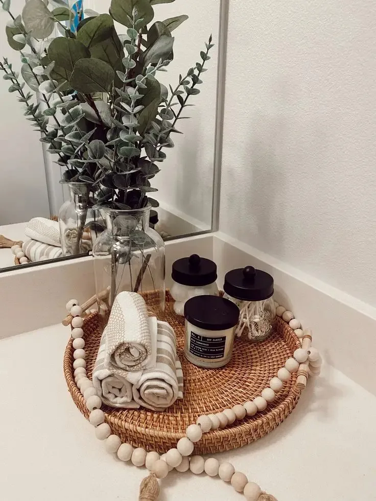This setup is so fun and cozy! A wicker tray packed with a few rolled towels, glass jars, and eucalyptus sprigs brings the perfect rustic balance.