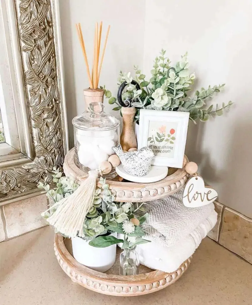 Decorative trays are lifesavers for pulling looks together. A wooden tray holding small jars, flowers, and candles creates a cozy, layered vibe.
