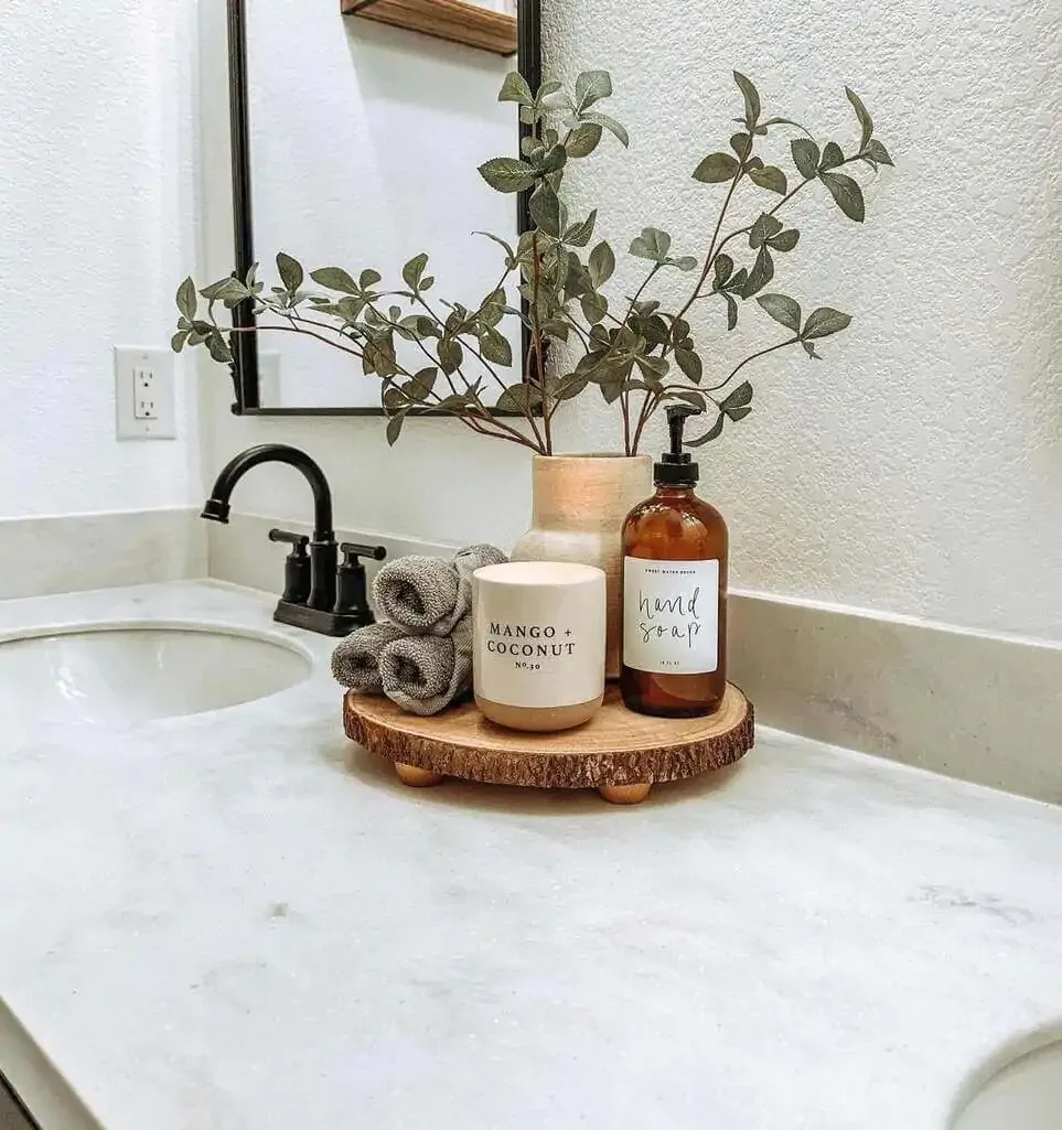 A simple circular tray can work wonders. I use one to corral my soap, candle, and lotion without cluttering the counter.