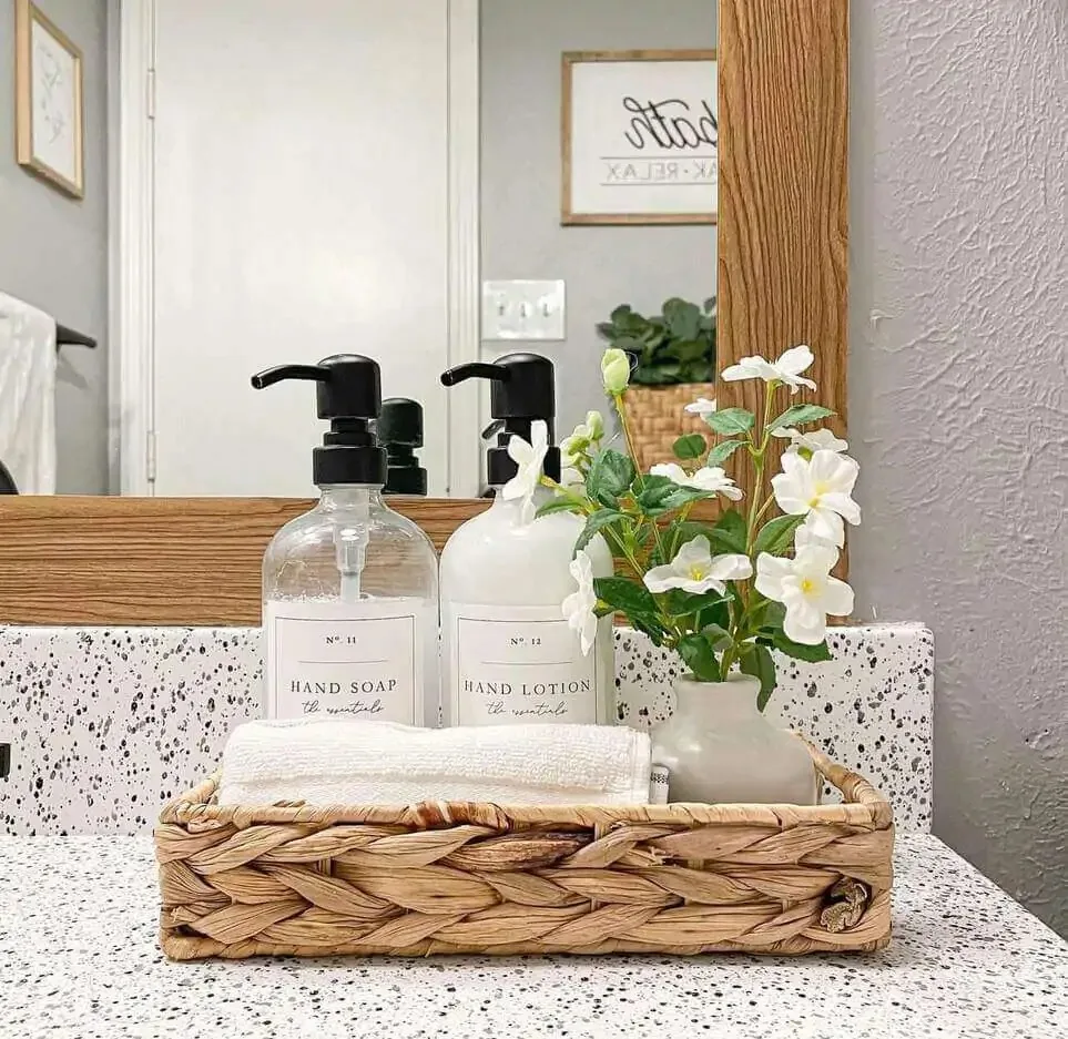 If you’re short on counter space, try using a woven basket! I love how this setup keeps essentials tidy, from soap pumps to a vase with fresh blooms.