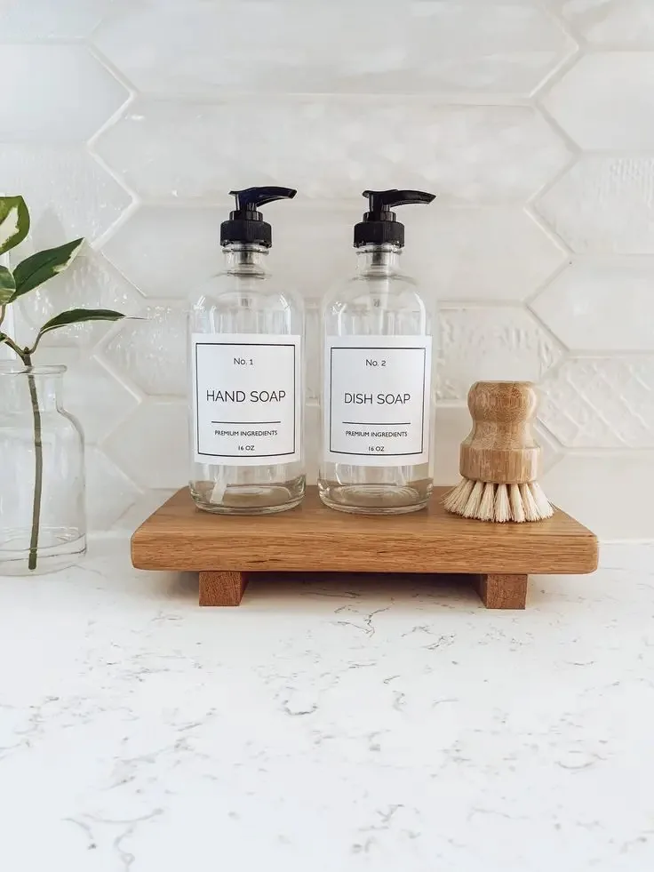 Glass soap dispensers are an easy upgrade if you’re aiming for a polished look. I love pairing them with a small wooden tray that holds everything together.