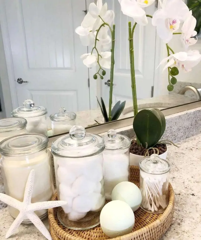 I’m obsessed with this setup because it makes any bathroom feel like a spa. Glass jars filled with bath salts, cotton pads, and swabs look polished yet effortless.