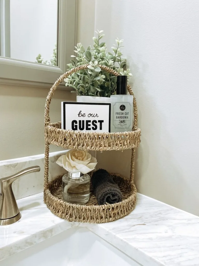 When I have guests over, I pull out my tiered basket. It’s perfect for keeping rolled towels, a scented candle, and cotton balls handy while looking absolutely adorable.