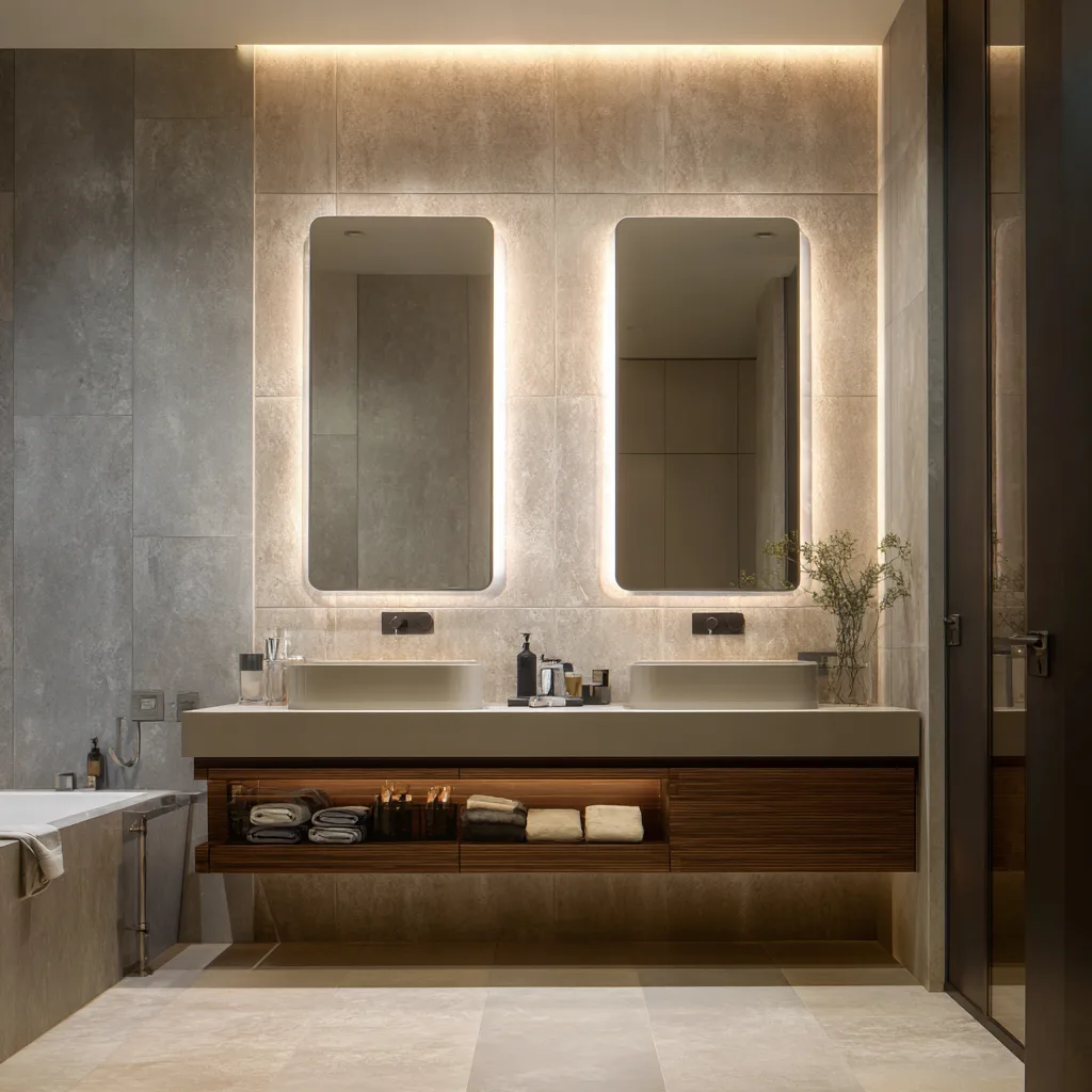 Ideally, aim for three layers of lighting, ambient (ceiling), task (mirror/vanity), and accent (under cabinets, sconces). This gives you flexibility and better visibility.