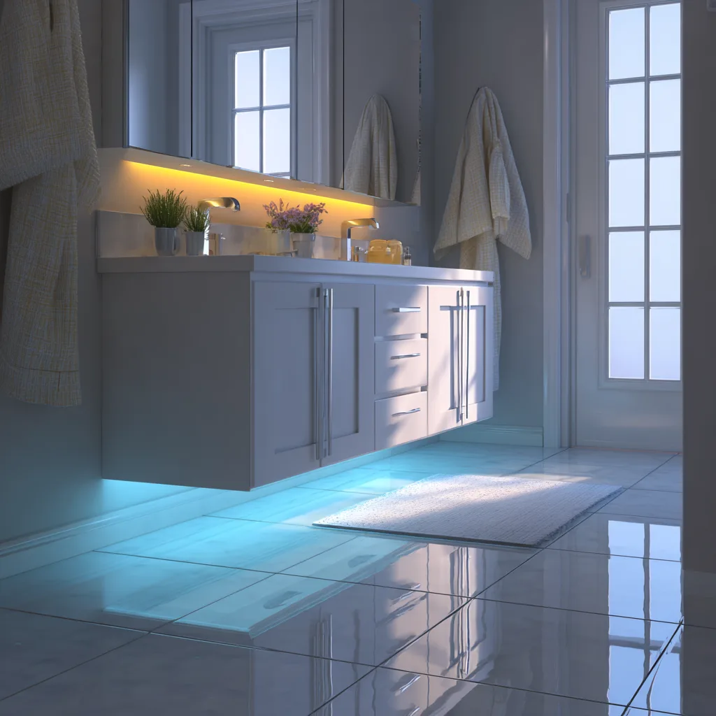Want your bathroom to feel like a luxe hotel suite? Install toe kick lighting beneath your vanity or cabinets. It’s like under-cabinet lighting, but for the floor.