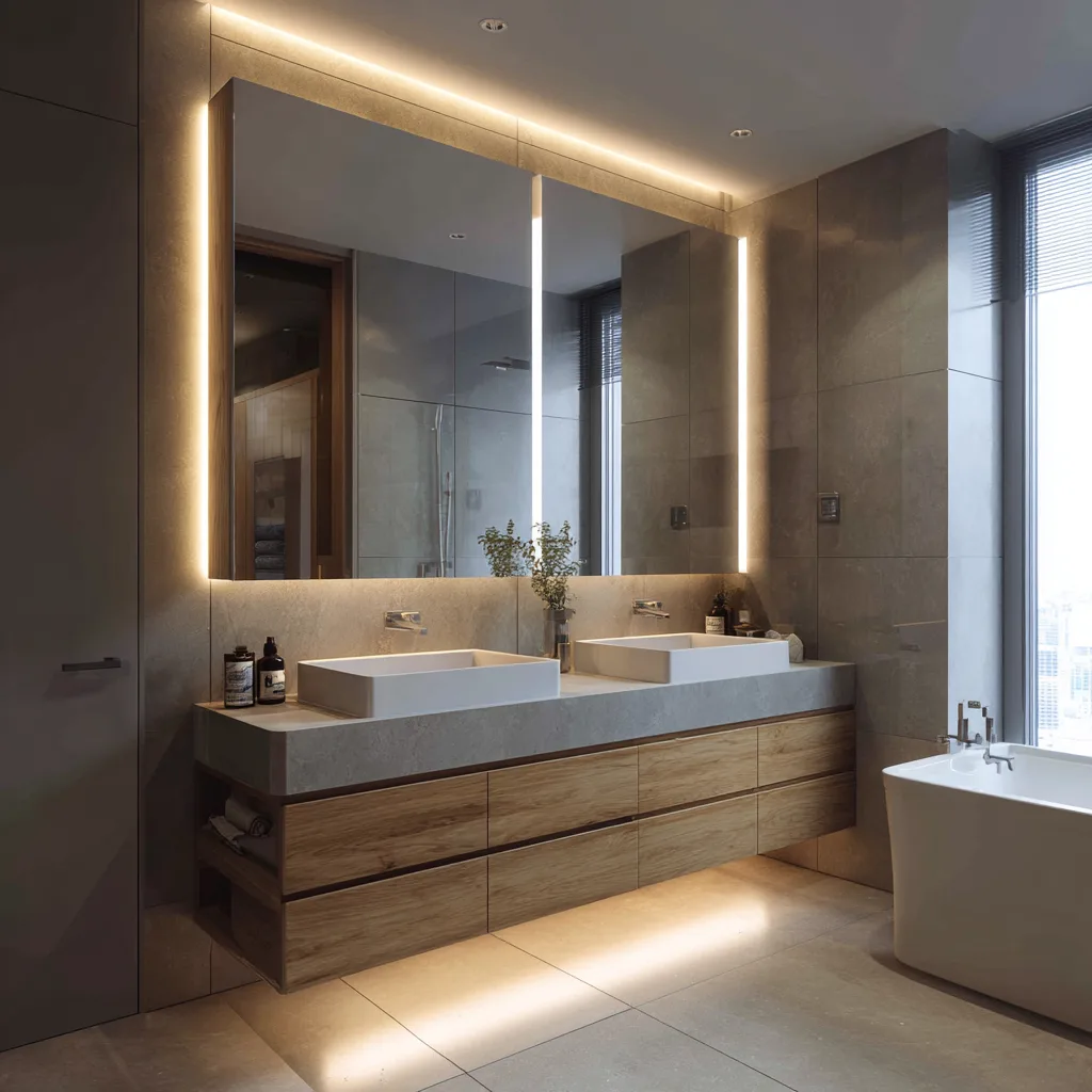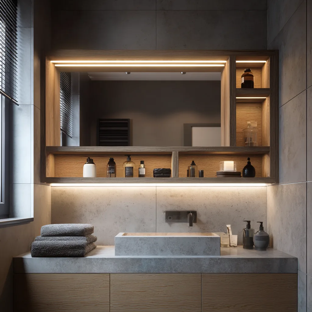 Here’s a clever one, I added a shelf above my mirror with integrated LED lighting underneath. It gives me light + storage in one smart move.
