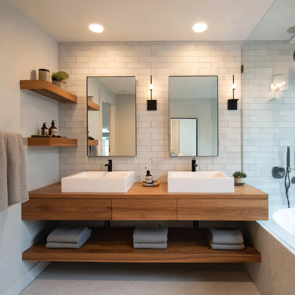 You loved the double sink vanity, but let’s add a floating shelf underneath to boost your storage and create that contemporary, open feel.