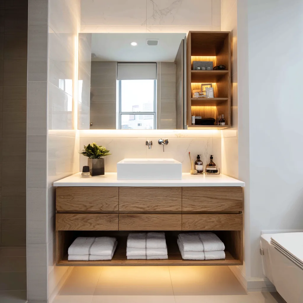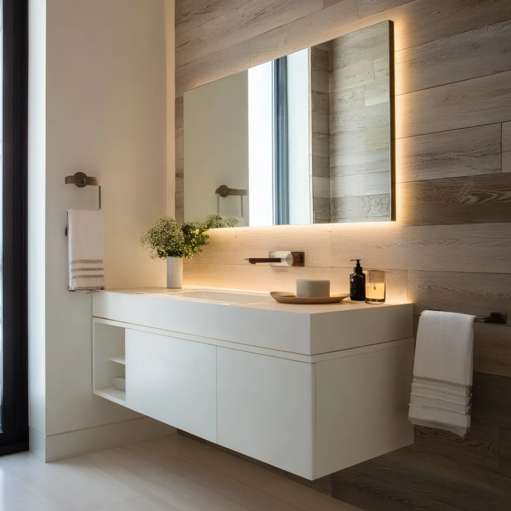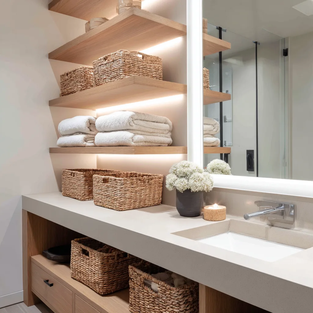Let’s talk about functional design with a twist, a vanity with integrated lighting. This vanity not only serves its storage purpose but also illuminates the area in a stylish way.