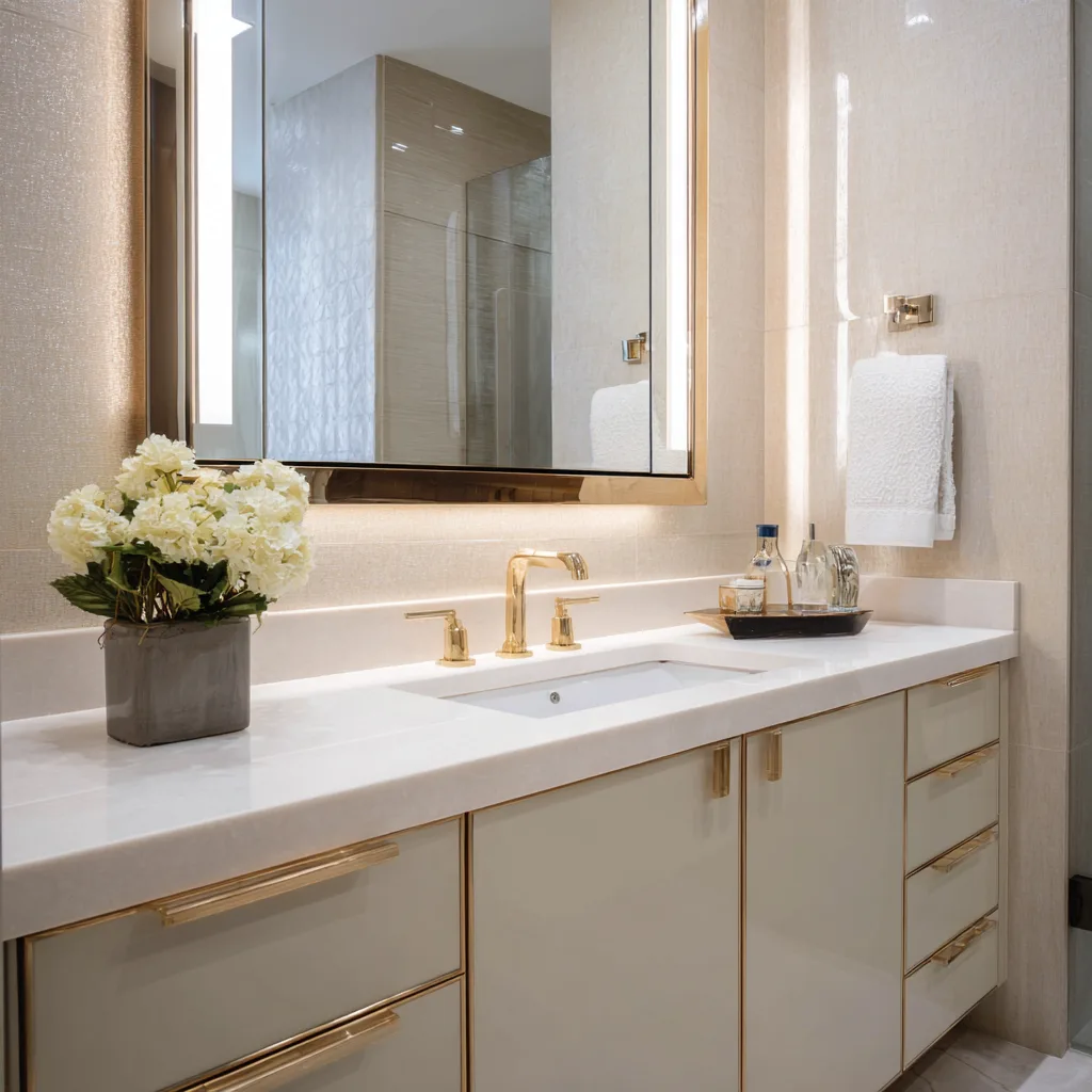 - Gold handles, mirror frames, and plumbing fixtures create a luxe atmosphere