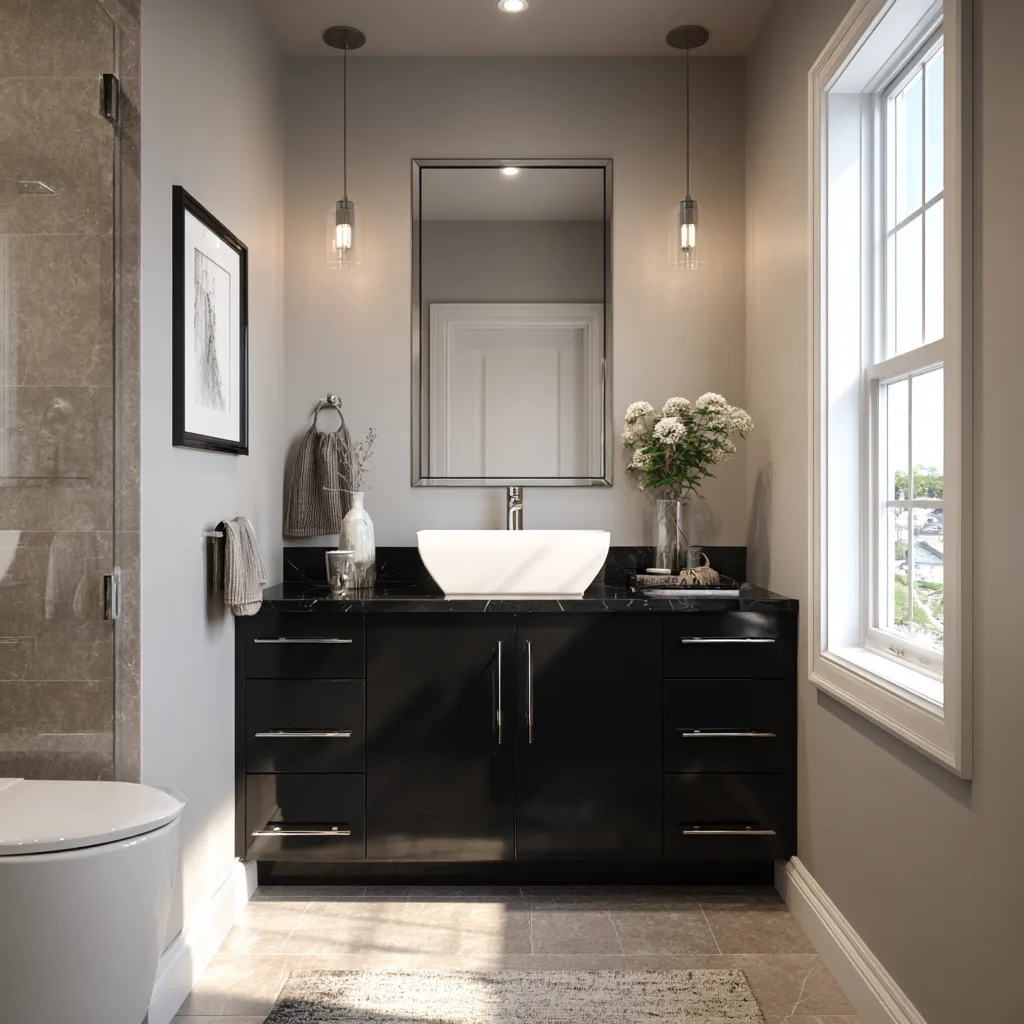 If you’re all about bold contrasts, a black vanity with a white sink is a stylish combo that adds sophistication and drama to your bathroom.