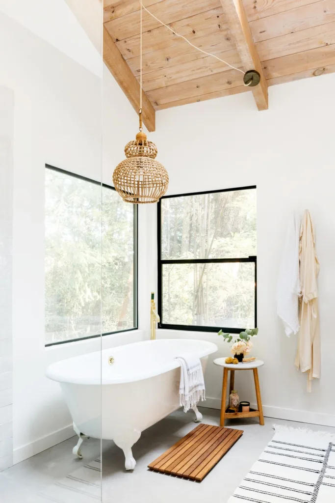 Natural tones and textures breathe life into bathrooms. Try adding earthy pieces like woven wood pendant lights to your walls for subtle warmth.