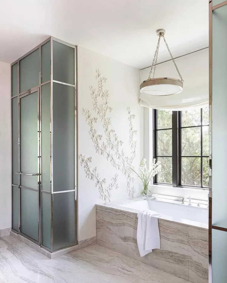 Understated patterns can bring calm energy into bathrooms. Feather-like textures or pastel wallpaper work wonders for keeping spaces cozy.