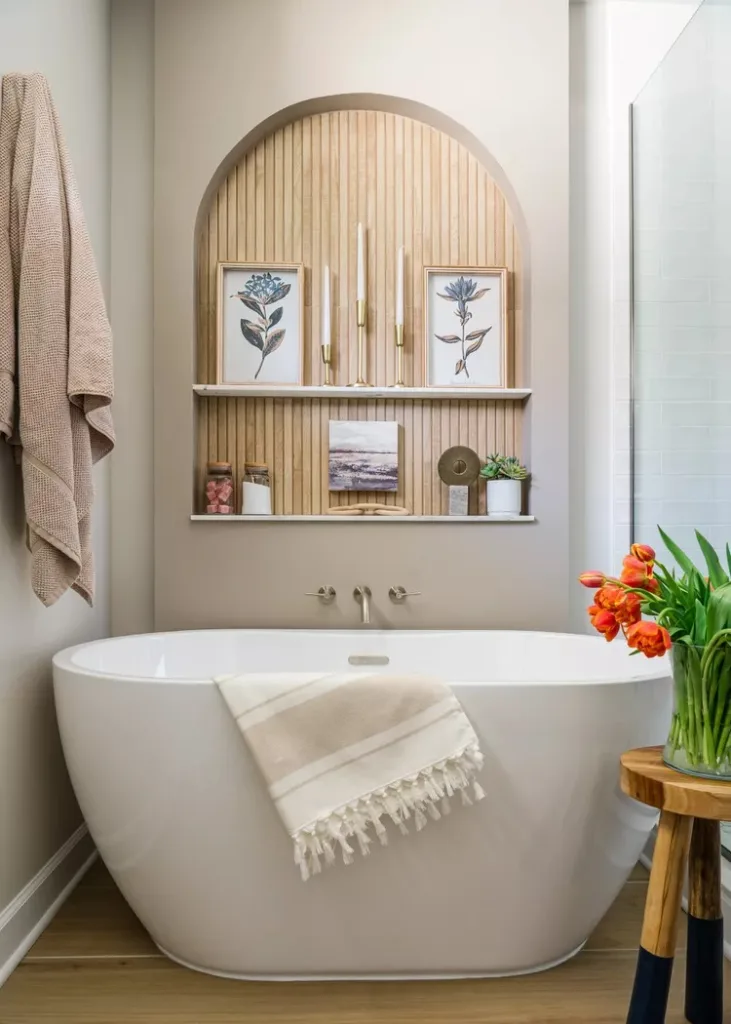 Wall niches are a two-in-one genius hack. I use mine to store candles, framed prints, and other small décor items. Plus, they give the bathroom a more styled look.