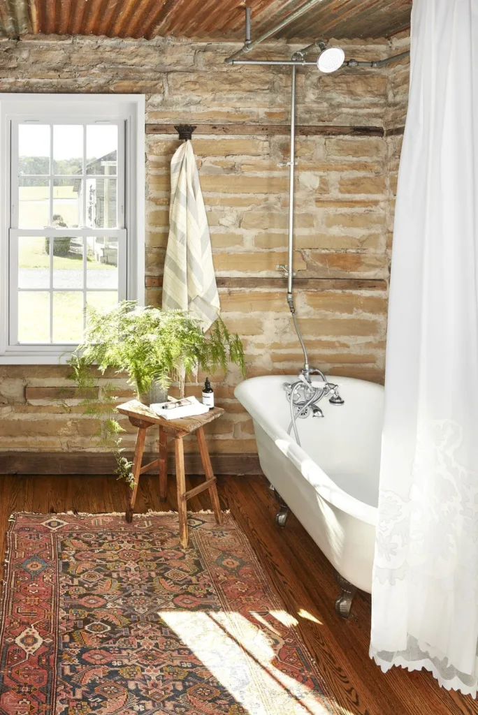 I’d recommend soft rugs and a clawfoot tub to complement the rustic aesthetic. It’s so cozy, you’ll love spending time here.