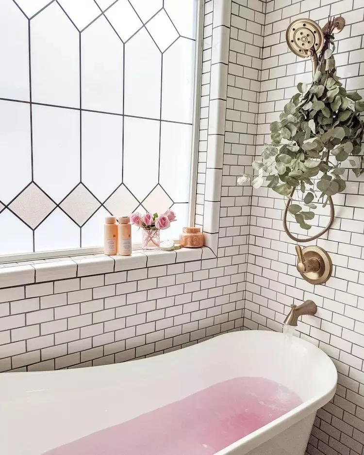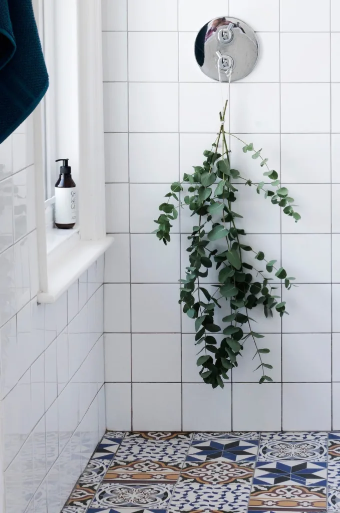I tie fresh eucalyptus to my showerhead all the time. It smells incredible and spruces up basic tiled walls.