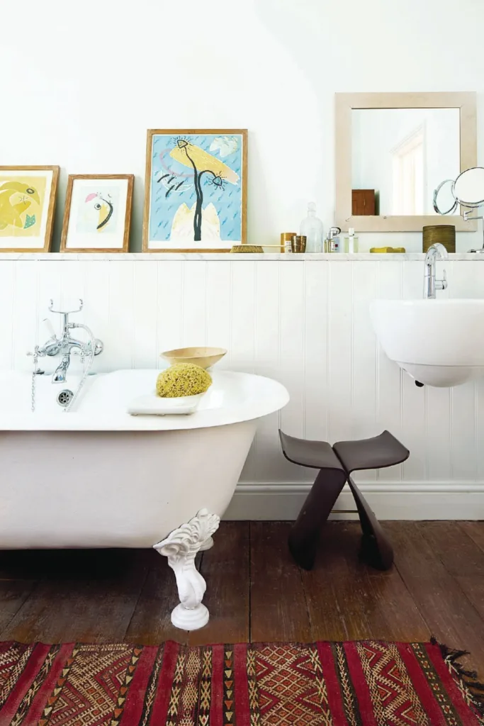Turning your bathroom into an art gallery is easier than you think! Leaning artwork casually on shelves creates a relaxed but creative atmosphere.