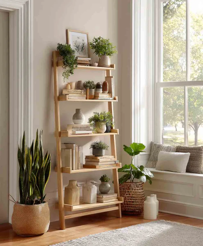 I found a rustic ladder shelf that fits right next to my window ledge. It holds books, small plants, and my favorite diffuser.