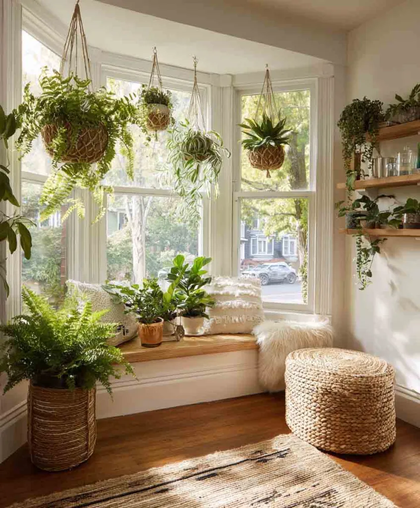 I went wild with this in my old apartment—hanging planters up top, leafy greens on the ledge, and even a tall palm in one corner. It made the whole room feel alive.