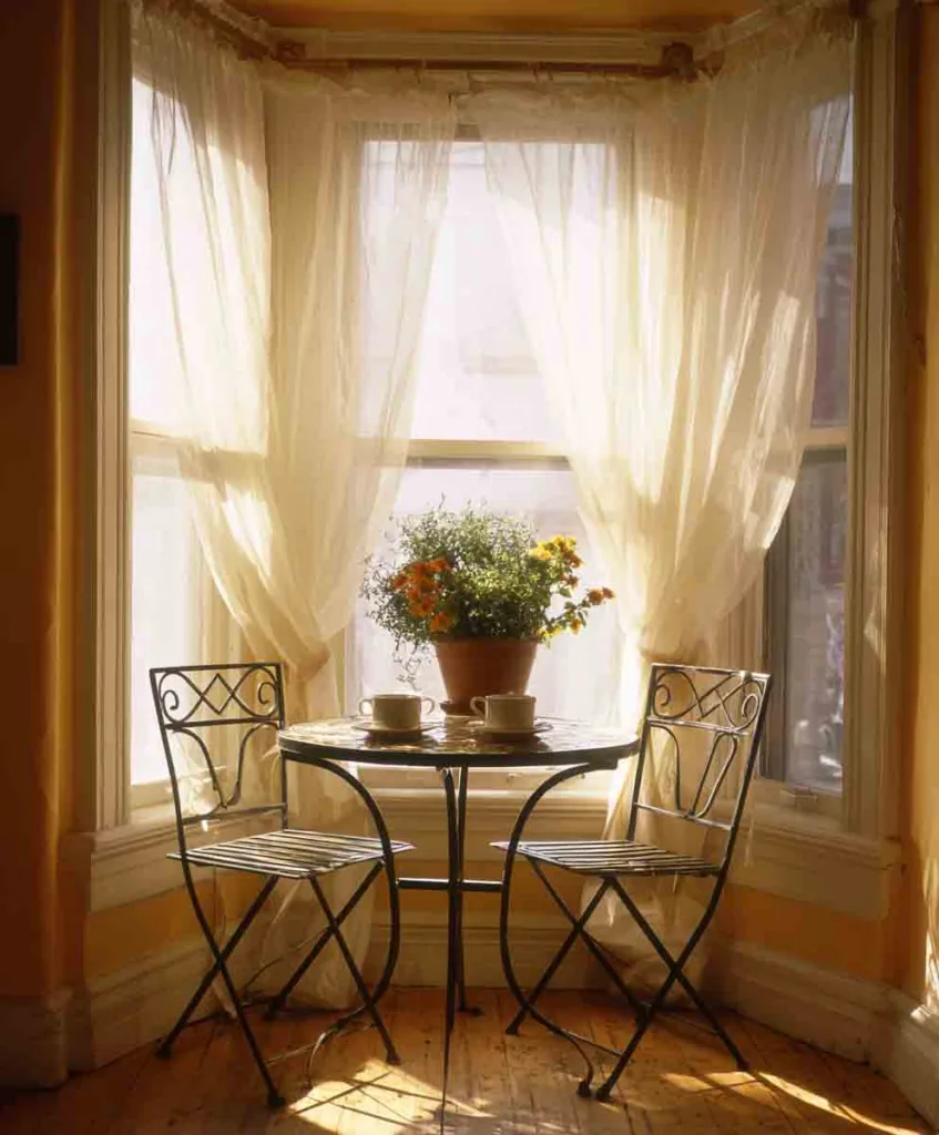 This setup turns your bay window into a little breakfast nook or evening wine spot. Especially great for kitchens or open dining rooms.