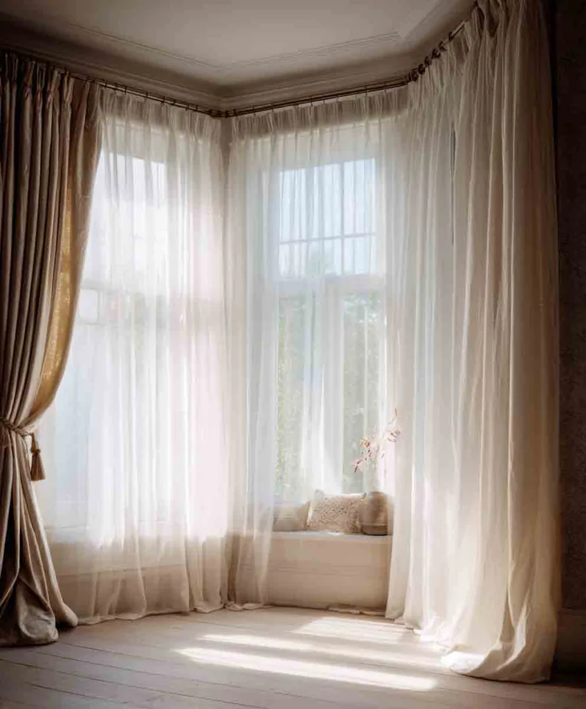 I used a mix of sheers and full-length panels on a custom rod that followed the bay’s shape. It felt instantly softer, more finished, even though I didn’t add furniture.
