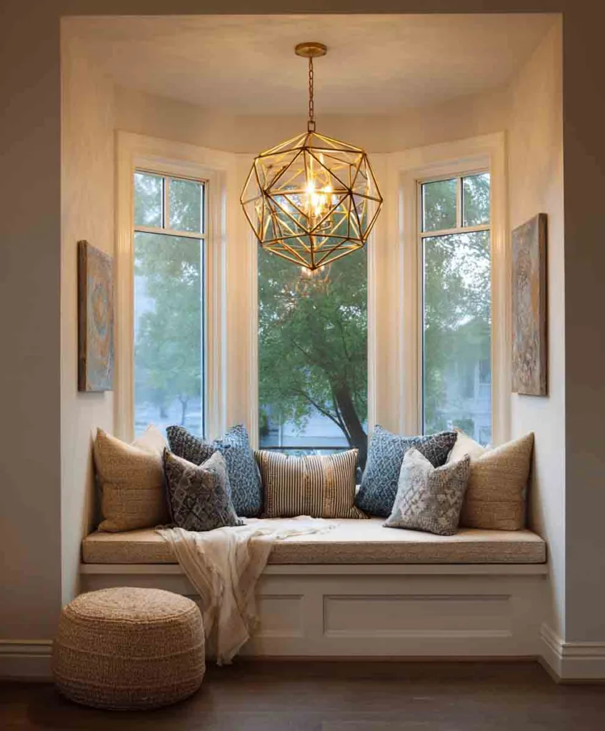 Even during the evening, your bay window can shine. A pendant light or mini chandelier draws the eye and adds cozy glow when the sun goes down.
