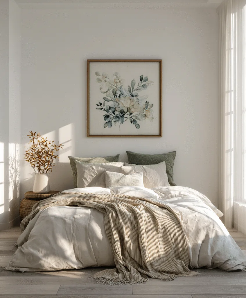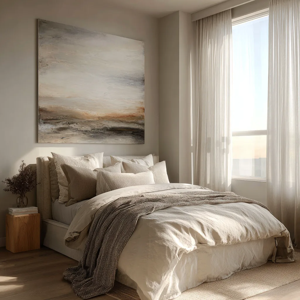 I used to think I needed a huge gallery wall, but honestly, one long art piece worked even better. It stretches across the bed nicely and feels clean and calm.