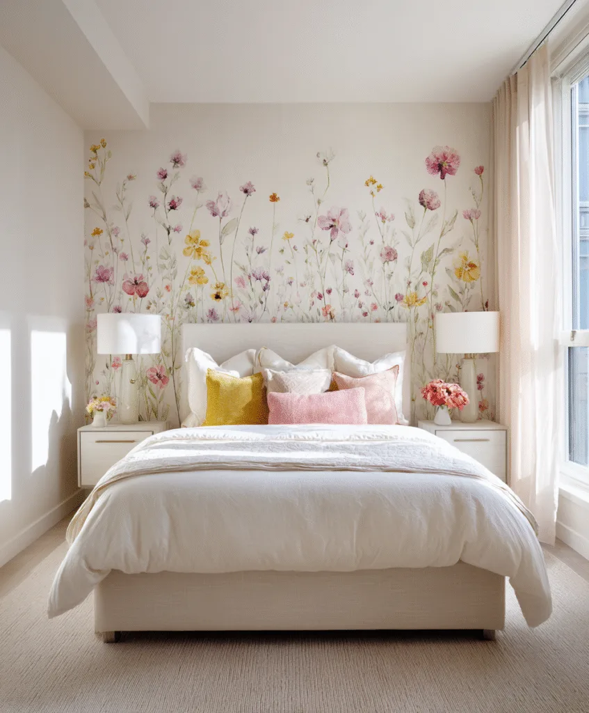 I was scared to commit to wallpaper, until I tried the peel-and-stick kind. I added a soft floral strip just above the headboard and it changed the whole vibe.