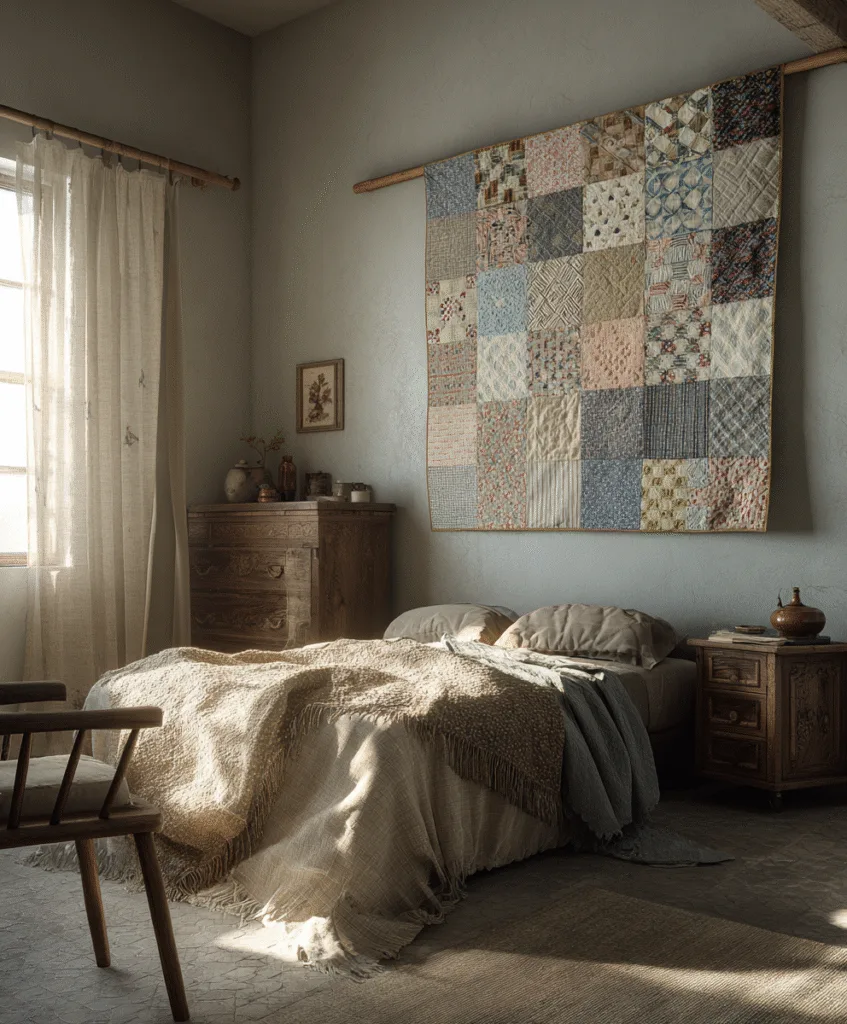 My grandmother’s old quilt sat in storage for years. One day, I hung it above the bed and it instantly made the space feel more personal.