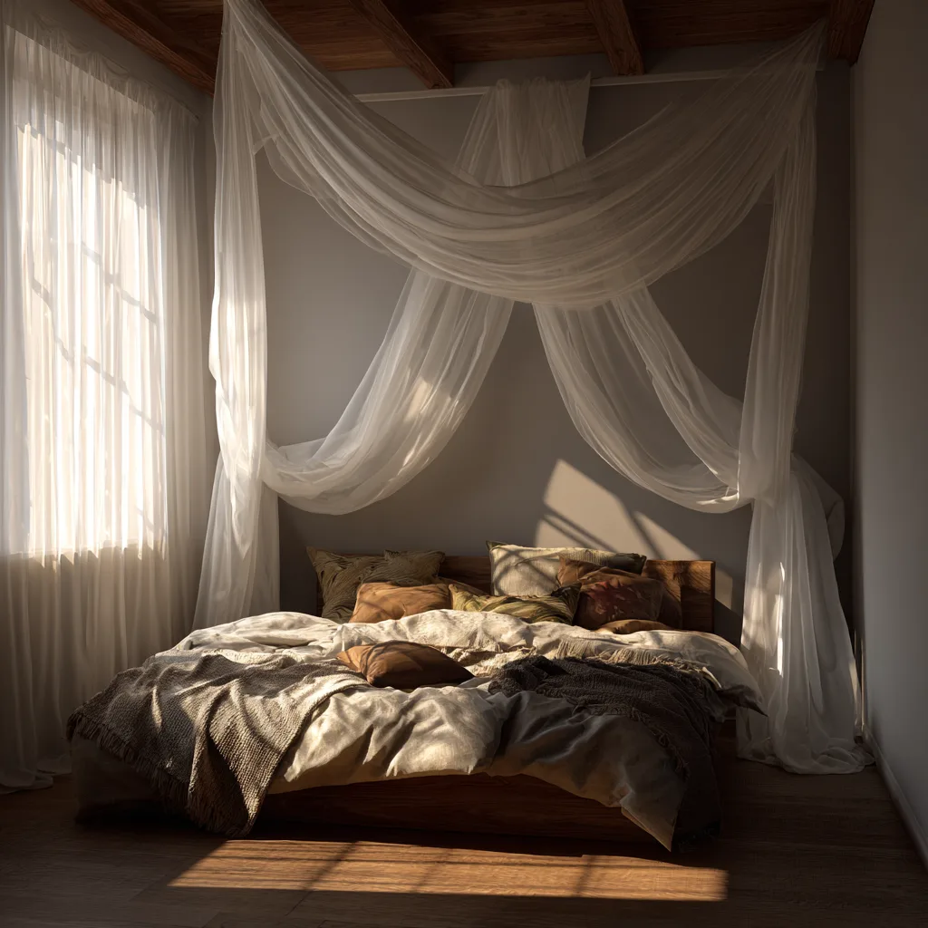 I once saw this in a boutique hotel and had to try it. Instead of art, I hung a slim curtain rod and added light, gauzy drapes. It felt like a bed canopy, without the bulk.