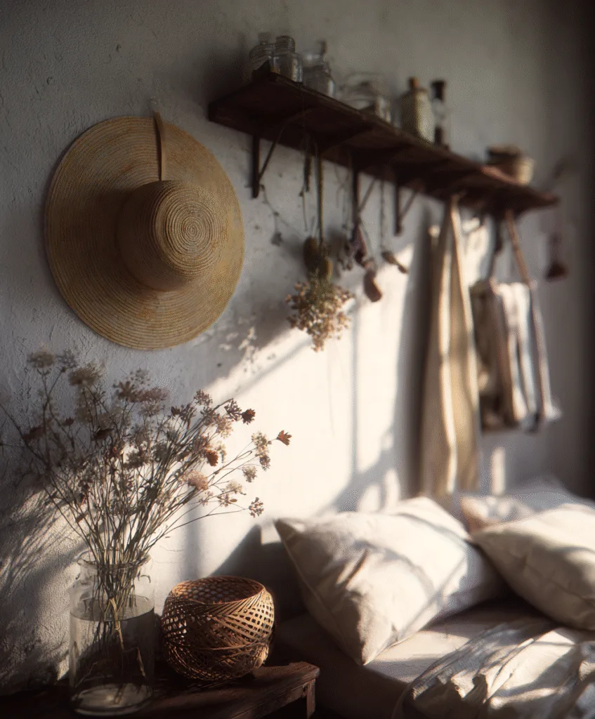 I needed something practical but cute. So I mounted a peg rail above the bed and used it to hang dried flowers, a tiny basket, and even a sunhat.