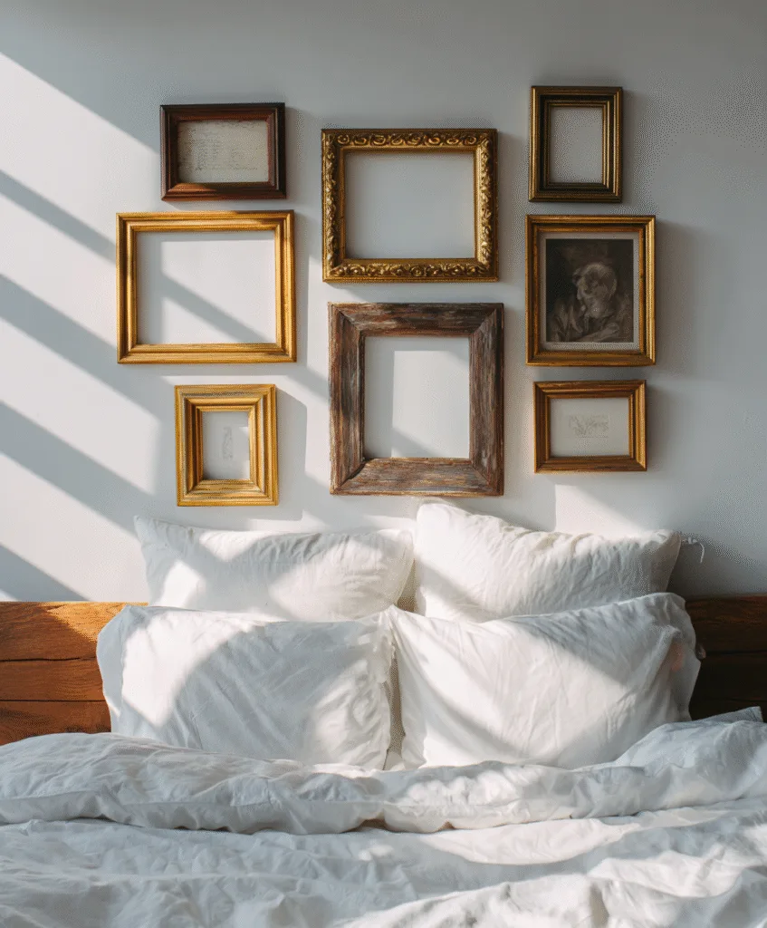 One of my favorite flea market finds? A pile of mismatched empty frames. I grouped them above my bed and created a layered look without needing any artwork.