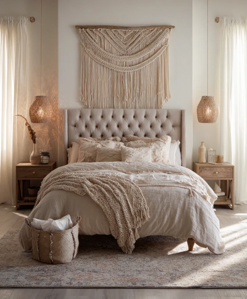 I’m a sucker for anything textured. I found a big cotton wall hanging that added softness above the bed without needing nails and frames everywhere.