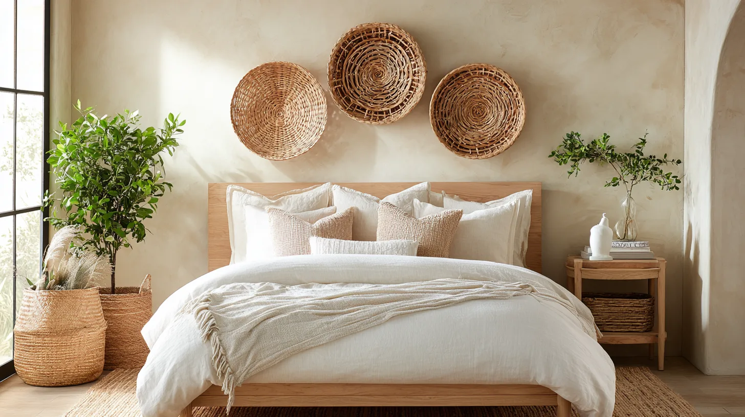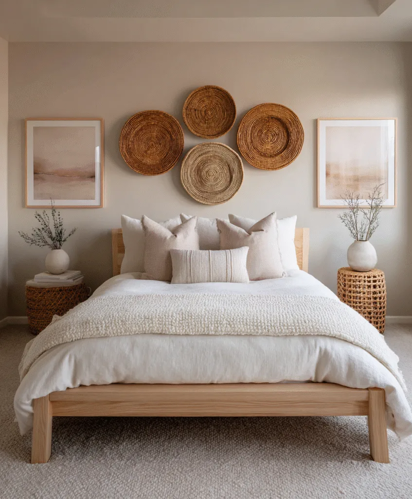 I didn’t think I’d be into baskets until I tried this. A row of three woven wall baskets added some nice texture above the bed, super affordable, too.