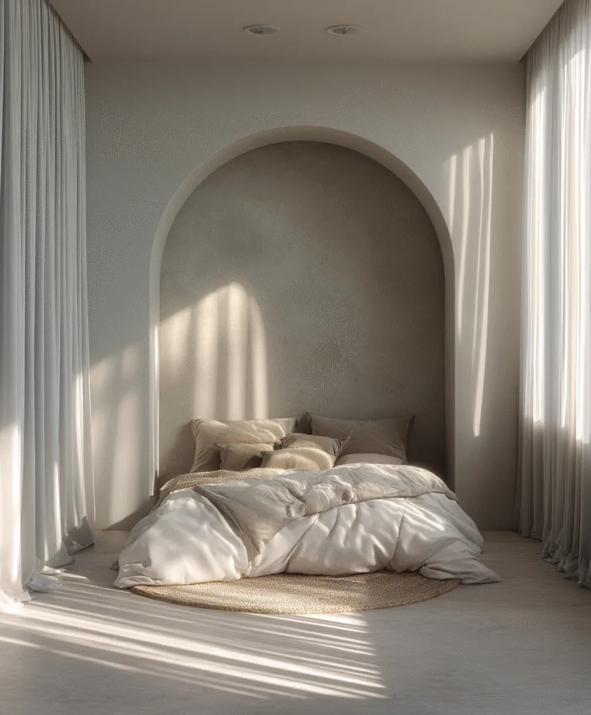 This was my boldest move, but it paid off. I skipped buying a headboard and painted a soft clay-colored arch behind the pillows.